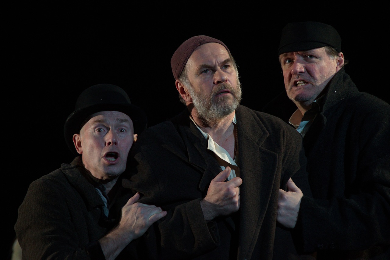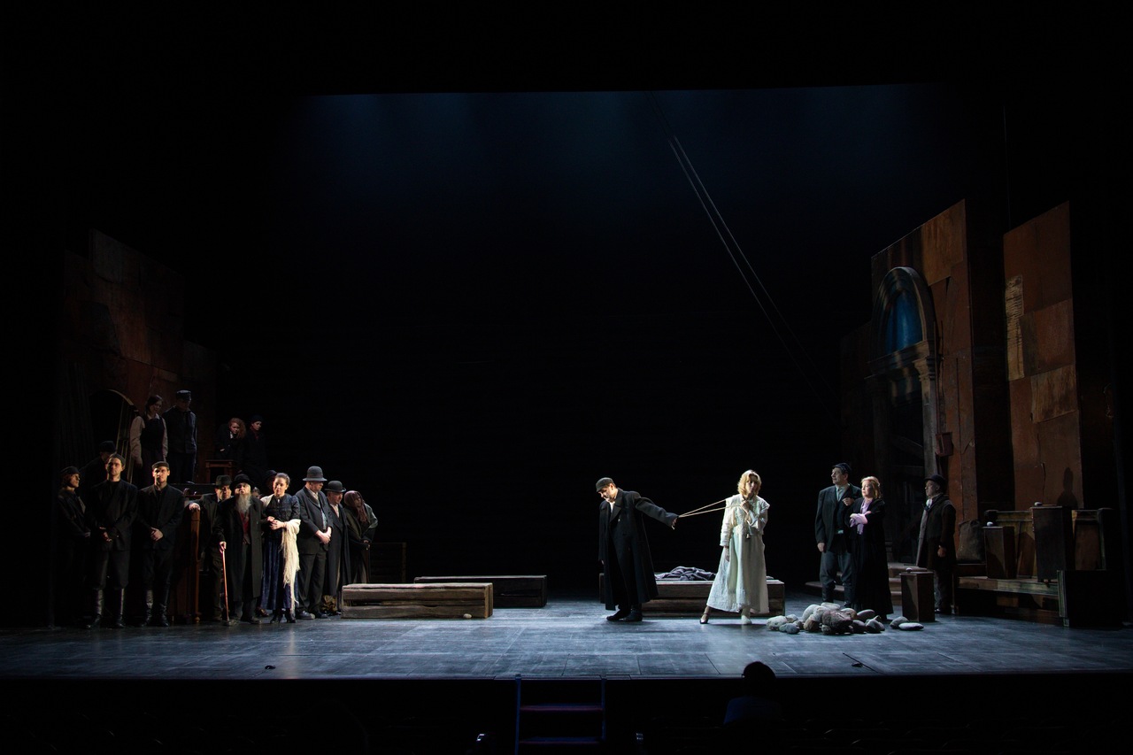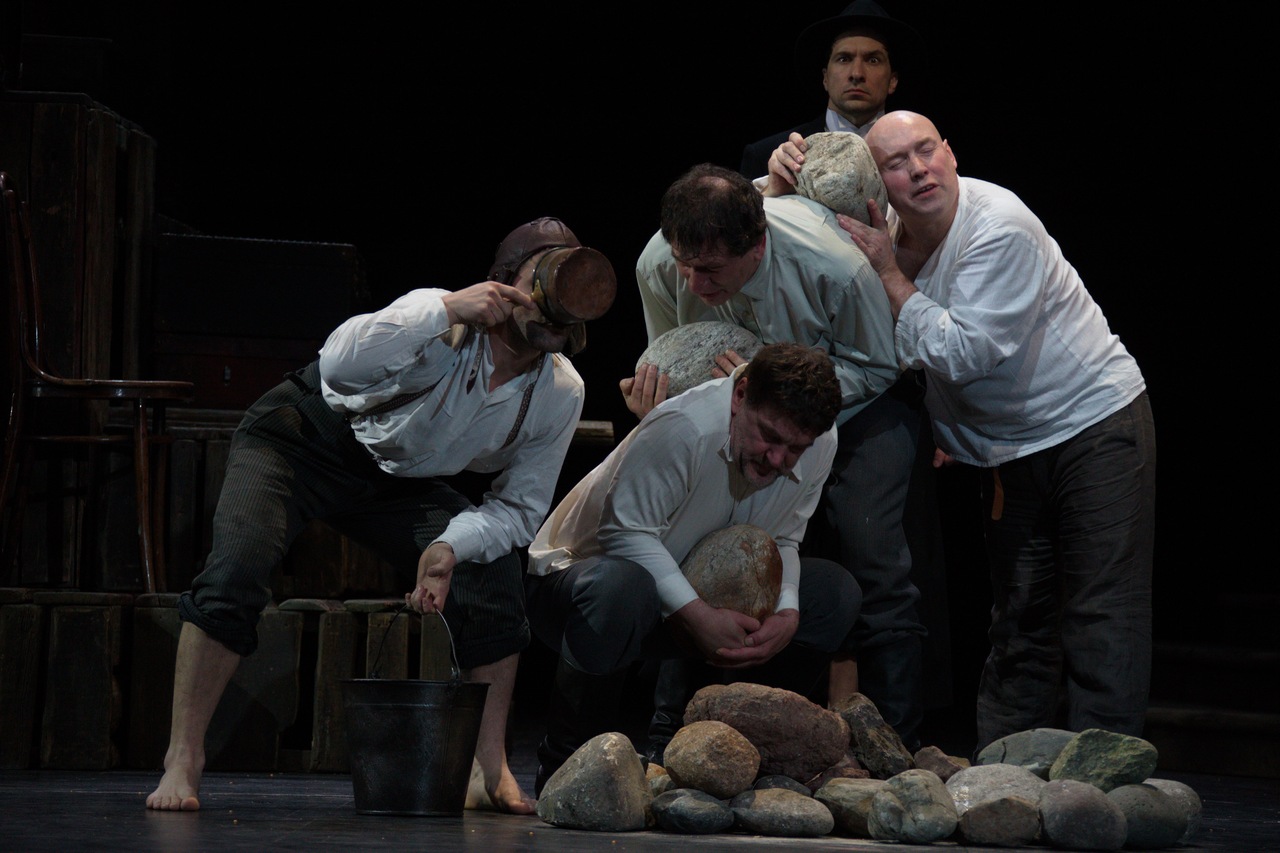 Kā siena stāv raudas, kliedzieni, šāvieni. Lido akmeņi, monētas, graudi. Metaforu valodā tiek izstāstīta ne tautas, bet Cilvēka drāma. Tas nav pesimisms, skaidro aktieri, - tā ir filozofija, pārdomas par esību.