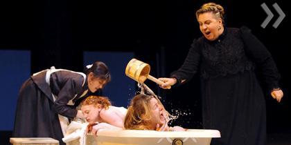 А 3 ноября в том же зале увидим провокационную версию драмы Александра Островского «Волки и овцы» (осенняя премьера 2009 года, выбор московских критиков для программы Russian Case 2010). Мурзавецкую играет Роза Хайруллина, Аполлона Мурзавецкого — Дмитрий Куличков, Глафиру — Анна Чиповская, Лыняева — Павел Ильин, молодую вдову Купавину — Дарья Мороз. А Яна Сексте предстанет в фантастическом образе Тамерлана — «собаки неопределенного пола». Критики называют трактовку Богомолова достаточно вольной, но именно благодаря внесенным изменениям режиссеру удается решить поставленные перед собой и артистами задачи. Скажем, действие переносится из 1870-х в первую половину XX века. Меняются согласно задумке смысловые акценты, потому что перед зрителем уже не помещичий, купеческий мир, хорошо известный по пьесам Островского, а новая условная реальность. Декорации выдержаны в черном, белом и красном (цвета Германской империи), звучат немецкие песенки и марши. Однако в Германии зритель не оказывается. Известный критик Роман Должанский определяет спектакль как «актуальный антифашистский и антирелигиозный памфлет», рассчитанный на понимание сказанного в нем современным зрителем.